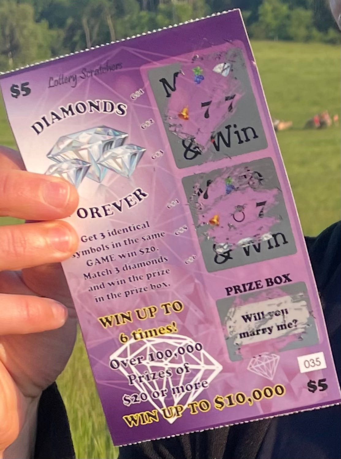Though I am a hopeful romantic, I’m not an irrational one. I know this story doesn’t end with “and they lived happily ever after.” In fact, just forty-eight hours later, we had our first “positive conflict” as an engaged couple. A ring—not even two rings—can grant you immunity to the heartaches of love, of blending lives with another human. But through the turbulence of life, the ups and downs, the live music and the silent car rides, the WNBA streaming and the wedding planning, I found someone who will take a megamillion moments and make each of them matter. And what better life lottery is there than that: finding someone who will make meaning with you.