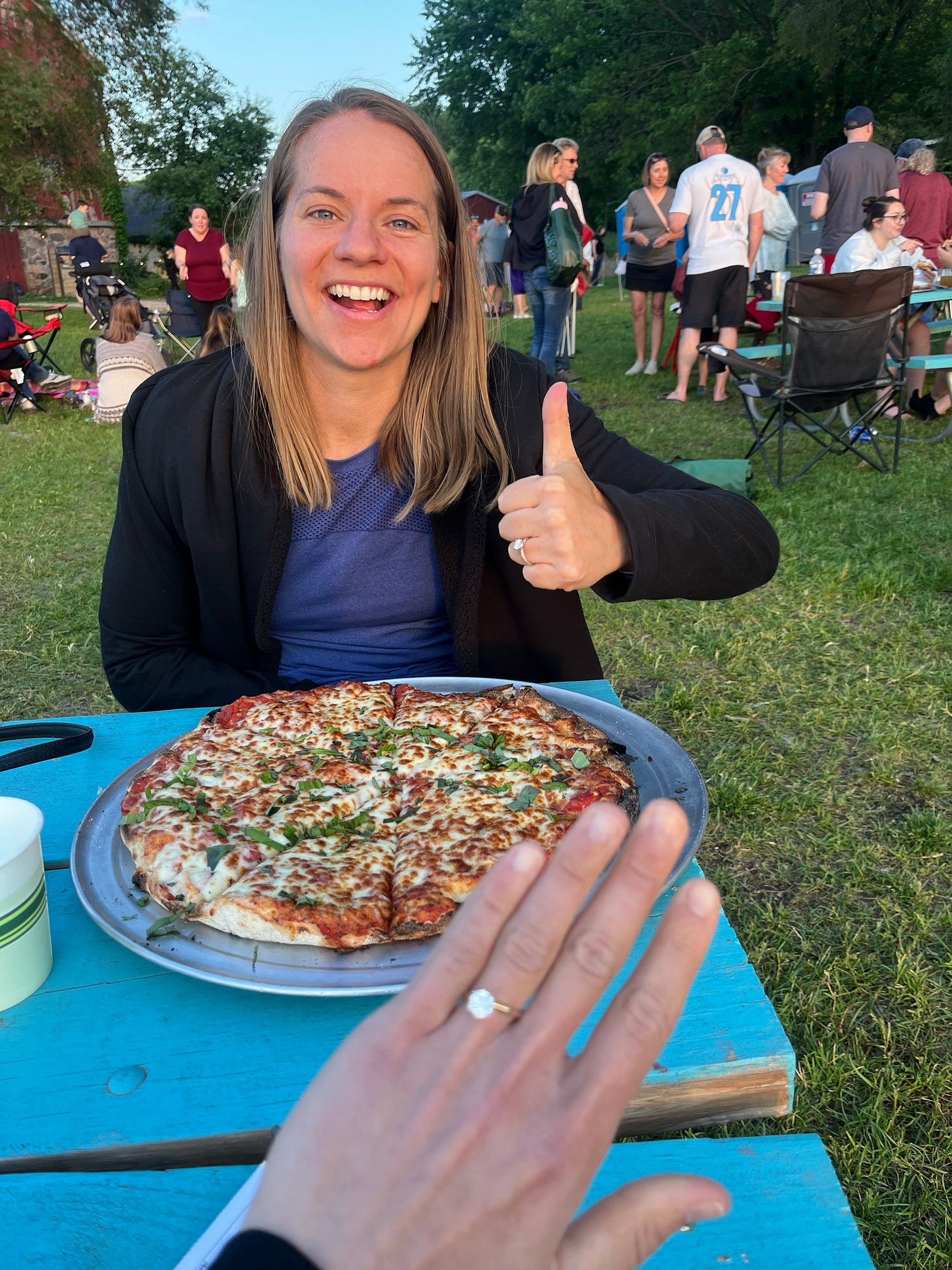 Almost a year later, Lucy and I returned to the Pizza Farm. I should’ve known it was happening. I mean what better place to propose than in Midwest utopia?! Not to mention Lucy brought a purse—a rarity for us unless we’re attending something fancy schmancy. But this is where I become Oblivious Olivia (cousin to Negative Nancy and Debbie Downer). For twenty-seven days and two hours I was on high alert that the proposal could happen at any moment, and yet when we arrived at the Pizza Farm, my mind surrendered its focus to the acoustics floating out of the barn, families huddled around their 14-inch doughy halo, little kids running in the nearby fields, and the cows off in the distance.